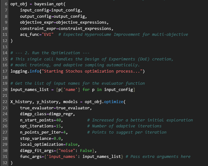 Define the Problem in Stochos: The optimization problem (input parameters, output parameters, objectives, and constraints) is defined in a Python script using the Stochos library.
