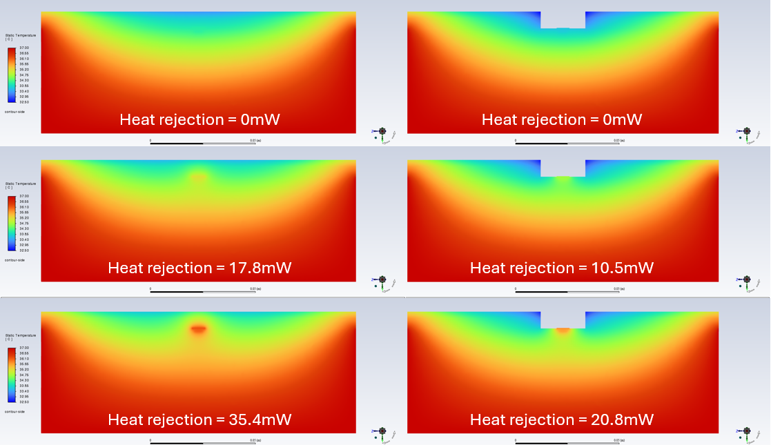 The image below shows the surface temperature distribution on the brain side of the implant device for the specified heat loads, corresponding to temperature rises of 1 and 2 degrees C. The image also shows the higher temperature of the covered implant device when a zero heat load is used.