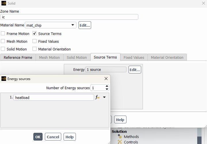 Cell Zone – Boundary Conditions: Materials are assigned to the corresponding cell zones. Default options are used for all cell zones except for the integrated circuit. For the integrated circuit, the source term is activated, and a volumetric heat source is applied.