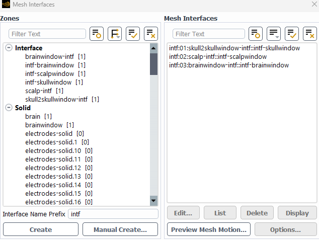 Mesh interfaces: Mesh interface zones are generated where the core mesh interfaces with the brain/skull mesh.
