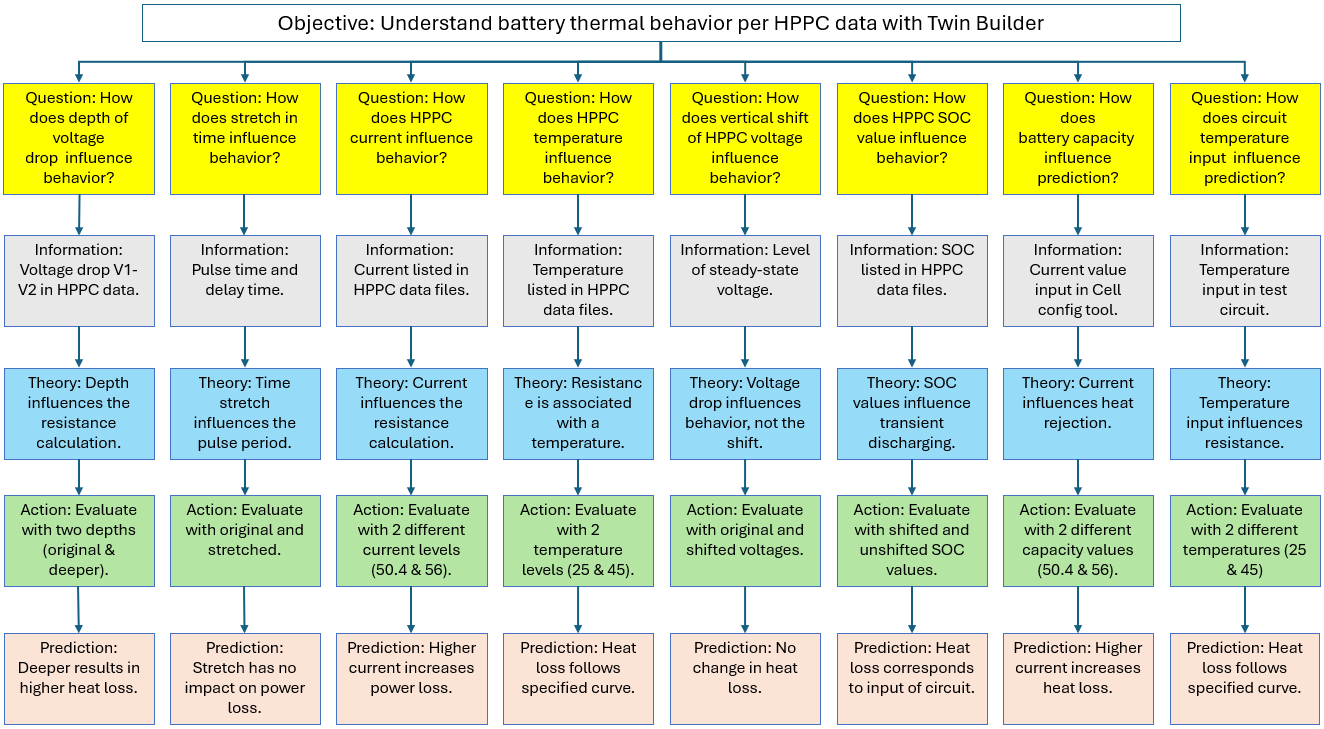 A thought map of the battery cell is generated to organize and represent ideas, concepts, or information in a structured way. The thought map below shows the simulation study’s objective and the questions asked to address it. Each question is followed by a theory, an action, and a prediction. Results would also be added to the bottom of each branch as they are generated.