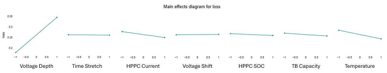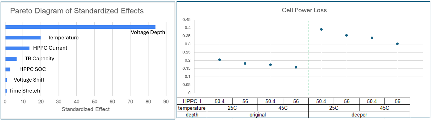 The chart below displays the transient battery cell power loss results for the treatments. The chart indicates that voltage depth is the most significant factor. When the voltage drop in the HPPC data is larger, the battery resistance is higher, resulting in higher power loss. Other input factors cause a smaller variation in heat loss.