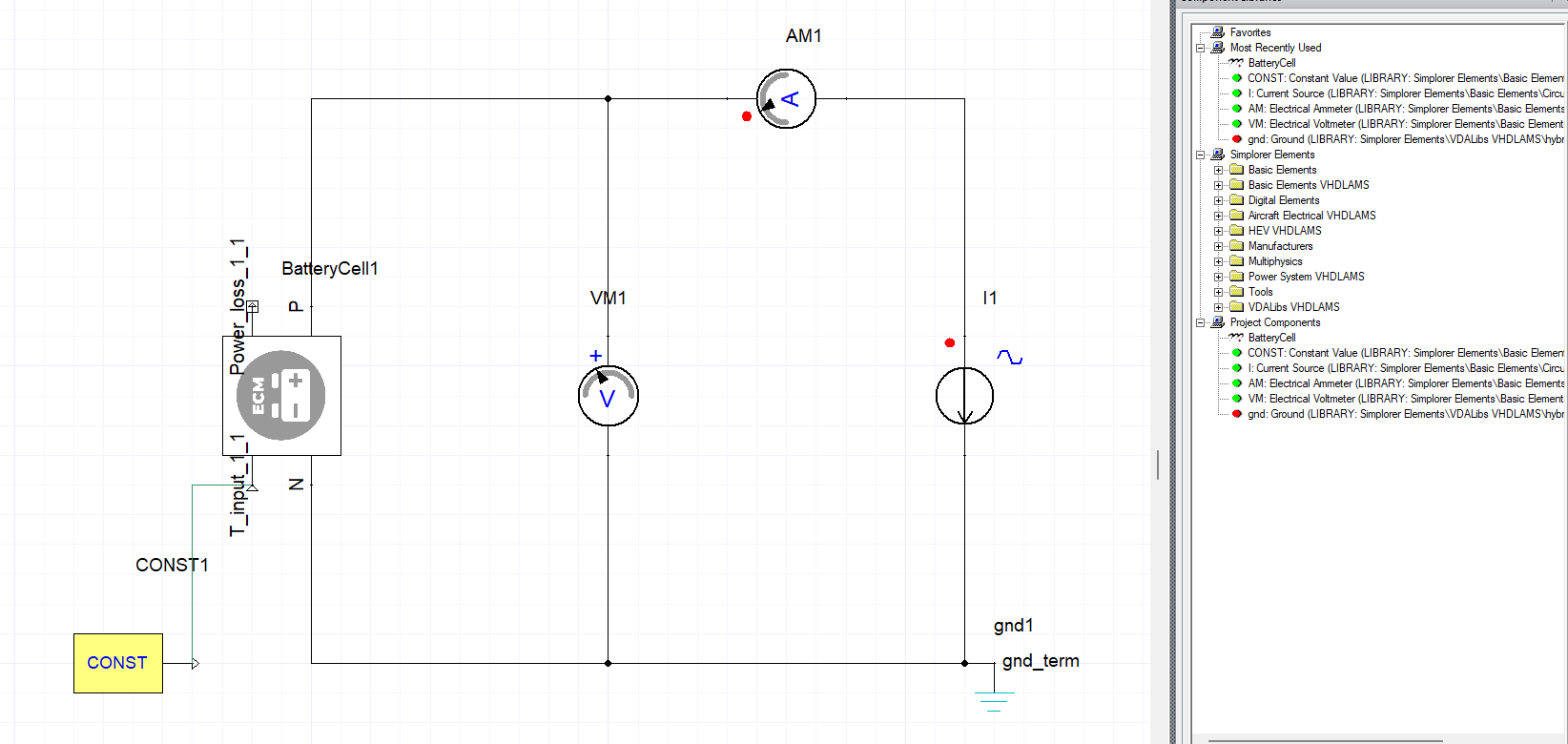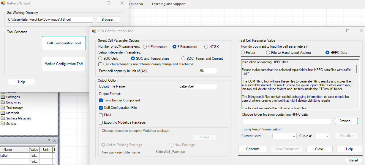 Twin Builder models are generated per the studies produced by the thought map. In this case, a 7-factor, 2-level fractional factorial DOE is employed, yielding 8 unique Twin Builder treatments. The images below show the sequence of steps for populating inputs for the battery model. The first image shows the Cell Configuration Tool in the Battery Wizard, and the second shows the resulting cell in a circuit.
