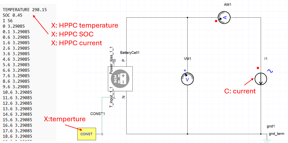 The map below shows an example battery HPPC data file and a Twin Builder circuit. Text items in red are variable or constant factors.