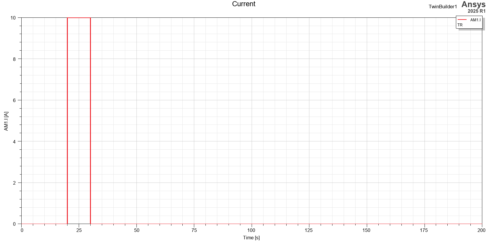 The current source uses a trapezoidal profile with an amplitude of 10 Amps for 10 seconds, following an initial delay of 20 seconds.