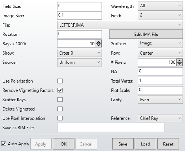 With Field setting, the image file is centered on defined field position. This permits a small target such as a bar chart to be moved to any location in the field of view. The resulting image is then centered on the chief ray coordinate of this field position.