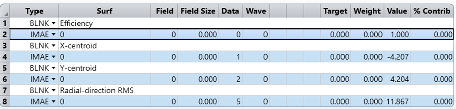 The merit function below presents using IMAE operand to do image analysis, with return of estimates of the efficiency of an optical system. Such estimates are made by launching many rays into the entrance pupil; computing the fraction of rays that pass through all surface apertures to any surface.