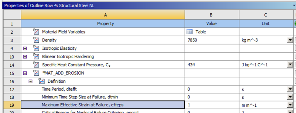 The other half of the adaptation from solid to particles is the erosion of the solid elements. It’s necessary to add the erosion definition to the Engineering data and apply criteria to eliminate the initial elements. In this example, effective strain is used, but several additional options are available.