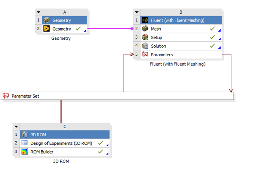 The Ansys Workbench project layout is shown in Figure 2. The geometry is connected to the Fluent session where the necessary model settings and input/output parameters are described1. The 3D ROM module is then dragged and dropped onto the project screen, after which it automatically connects to the rest of the project.