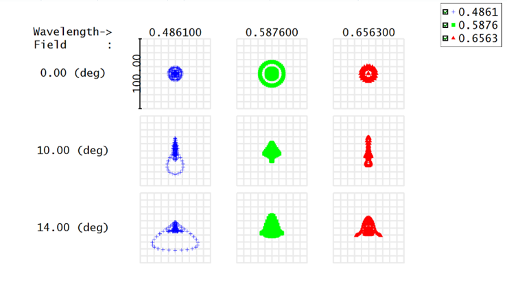 This lens features a 28-degree (±14) field, as shown in Figure 2. The design operates across the visible spectrum (400 nm–700 nm). Geometric MTF values, calculated at 20 lp/mm, all exceed 0.65 (see Figure 3). Figure 4 presents spot diagrams for all three sampled fields and wavelengths.